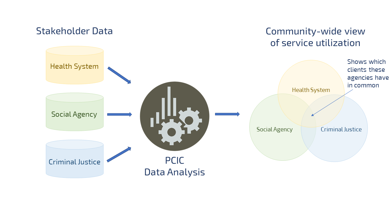 This process reveals which clients these agencies have in common and which clients use a disproportionate number of services. The analysis provides an idea of improper uses of services, to inform better diversion programs; overlapping services across agencies, which could be reduced by using shared care plans; and gaps in services, which could be improved by streamlining referrals between needs and resources.
